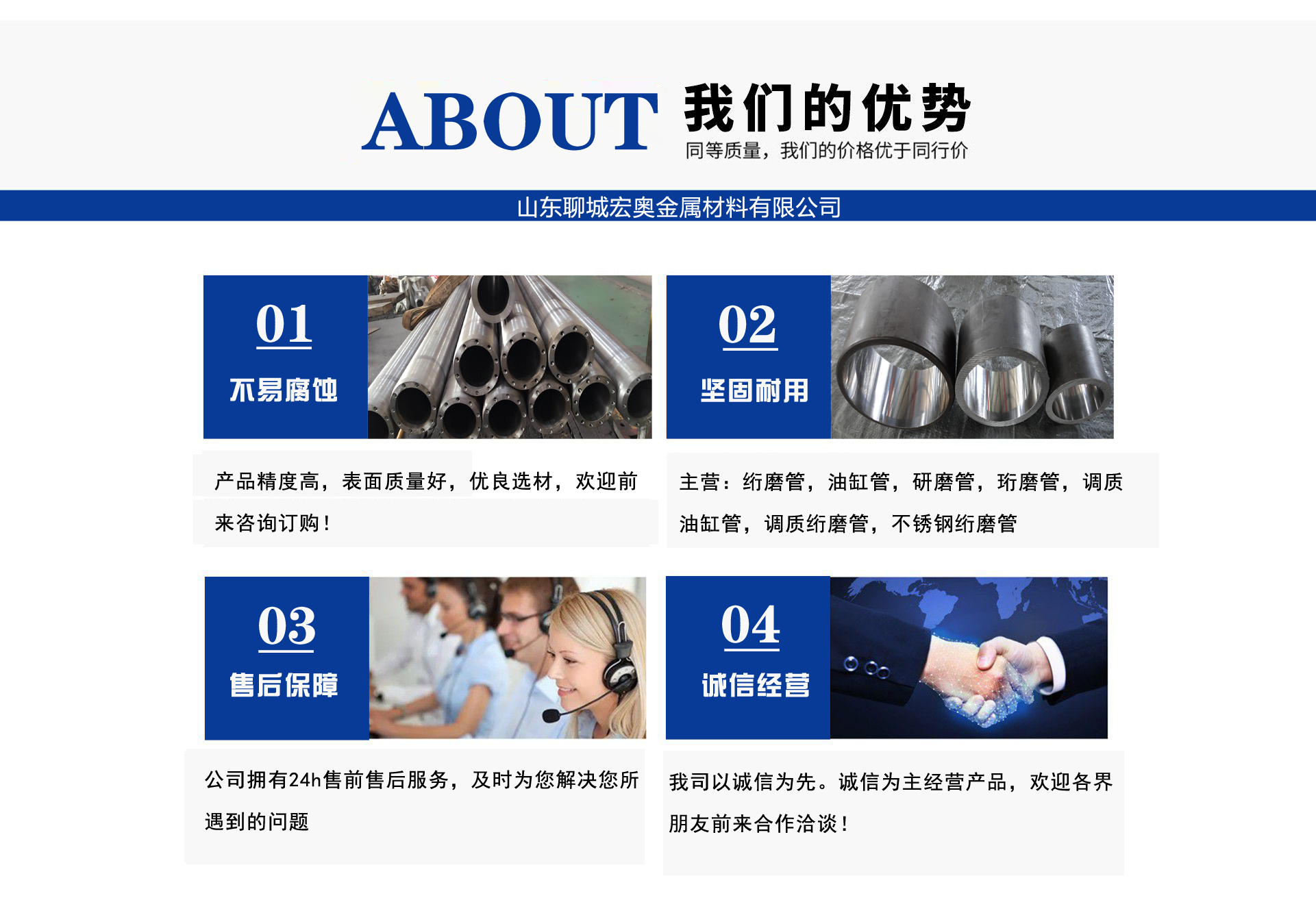山東聊城宏奧金屬材料有限公司位于風(fēng)景秀麗的江北水城-聊城。地理位置優(yōu)越,交通便利。主營絎磨管,油缸管,研磨管,珩磨管,調(diào)質(zhì)油缸管,調(diào)質(zhì)絎磨管,不銹鋼絎磨管等產(chǎn)品 廣泛應(yīng)用于礦山、起重、船舶、煤炭、運(yùn)輸、化工、科研、軍工等工業(yè)領(lǐng)域?! 」緫{借雄厚的實(shí)力,豐富齊全的規(guī)格品種,完善的質(zhì)量保證,合理的價(jià)格,優(yōu)質(zhì)的服務(wù),不斷地受到新老用戶及業(yè)內(nèi)人士的肯定和信任,我們本著及用戶之所及,想用戶之所想的服務(wù)宗旨不斷地拼搏,進(jìn)取,在此對(duì)多年來支持我們的各行各業(yè)的新老朋友表示由衷的感謝,愿我們今后的合作更加愉快! 歡迎國內(nèi)外新老客戶來公司視察、蒞臨指導(dǎo)工作!...